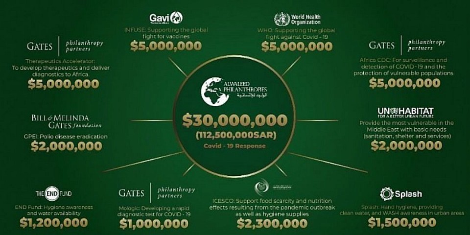 بالتعاون مع مجموعة من شركاء المؤسسة. ومن خلال هذا التعاون، ستركز هذه المبادرات على معالجة الآثار الصحية والاقتصادية لهذه الجائحة، مثل دعم تصنيع الاختبارات التشخيصية السريعة للكشف عن الفيروس في الدول النامية، وتقليل التأثير طويل الأجل للتداعيات الاقتصادية المحتملة للجائحة. كما يشمل التمويل مبلغاً إضافياً قدره 20.6 مليون دولار أمريكي تضاف إلى 9.4 مليون دولار أمريكي تم تخصيصها في وقت سابق، والتي أعيد تخصيصها مرة أخرى لدعم محاربة انتشار فيروس كورونا. ويأتي إعلان تخصيص 30 مليون دولار أمريكي لمحاربة انتشار فيروس كورونا بعد أن وضع سمو الأمير الوليد بن طلال آل سعود العديد من الأصول التي يمتلكها، بما في ذلك فندق فورسيزونز ومدارس المملكة، والبنك السعودي الفرنسي، وشركة التصنيع الوطنية تحت تصرف الحكومة السعودية لدعم جهود المملكة في مكافحة انتشار فيروس كورونا. وكان آخر دعم قدمته مؤسسة الوليد للإنسانية "العالمية" (لبنان) هو تقديم المساعدة في إعادة مئات الطلاب اللبنانيين الذين يدرسون في فرنسا وإيطاليا وإسبانيا. ويواصل هذا التمويل دعم منطقة الشرق الأوسط وشمال أفريقيا، حيث تم تخصيص قسم كبير منه لدعم عدة مبادرات عبر المنطقة، بما في ذلك تقديم تبرعات لموائل الأمم المتحدة لتحسين شبكة المياه والصرف الصحي وتعزيز مفهوم النظافة الصحية في المجتمعات الأشد حاجةً، بالإضافة إلى بناء المنازل وإعادة تأهيل المساكن المتضررة للمساعدة في معالجة مشكلة الاكتظاظ السكاني في الأحياء الفقيرة وتطبيق التباعد الاجتماعي. وعن هذا الإعلان، قال صاحب السمو الملكي الأمير الوليد بن طلال بن عبد العزيز آل سعود: "لقد أصبح من المهم الآن أكثر من أي وقت مضى، وخصوصاً في هذا الوقت الذي نواجه فيه جميعنا هذه الأزمة غير المسبوقة، أن نجمع مواردنا معاً في المعركة ضد فيروس كورونا. وفي الوقت الذي تكافح فيه العديد من الدول المتقدمة لمواجهة هذه الجائحة، يجب علينا ألا ننسى البلدان النامية في أفريقيا والدول الأكثر حاجة في الشرق الأوسط". وتابع سموه: "يمتد تاريخ مؤسسة الوليد للإنسانية "العالمية" في دعم المبادرات التنموية والإنسانية الموجهة للأشخاص الأشد حاجةً وتقديم العون لهم إلى 40 عاماً، ونؤكد بأننا سنواصل هذه المسيرة في مواجهة هذه الجائحة". ومن جهة أخرى، تعمل مؤسسة الوليد للإنسانية "العالمية" مع منظمة العالم الإسلامي للتربية والعلوم والثقافة، وذلك بهدف للمساعدة في تخفيف المعاناة الناتجة عن التداعيات الاقتصادية لانتشار فيروس كورونا، بالإضافة إلى تعزيز التوعية بأهمية النظافة في البلدان النامية. وسيعزز المبلغ المخصص للمنظمة قدرات التصنيع المحلية لإنتاج مستحضرات النظافة الشخصية ومعدات الحماية في أفريقيا، فضلاً عن تمكين رواد ورائدات الأعمال الشباب في القطاعات غير الرسمية والمحلية.